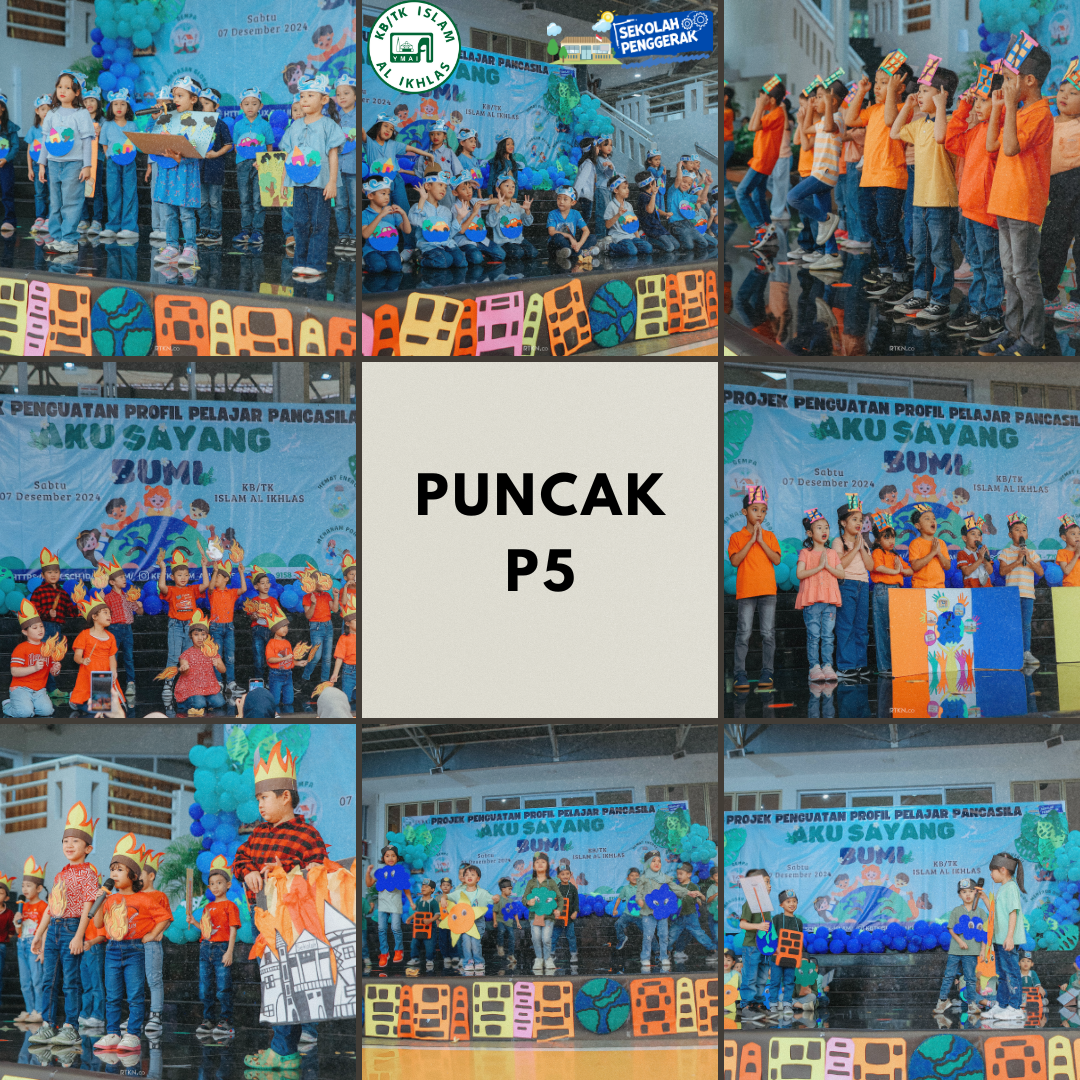 Penampilan Puncak P5 di KB/TK Islam Al-Ikhlas dengan tema “Aku Sayang Bumi” merupakan sebuah acara yang menyentuh hati dan sarat makna, di mana anak-anak dari berbagai kelompok TK B mempersembahkan presentasi dan penampilan yang mendidik serta penuh kreativitas, mengangkat isu-isu penting tentang bencana alam dan upaya menjaga kelestarian bumi.