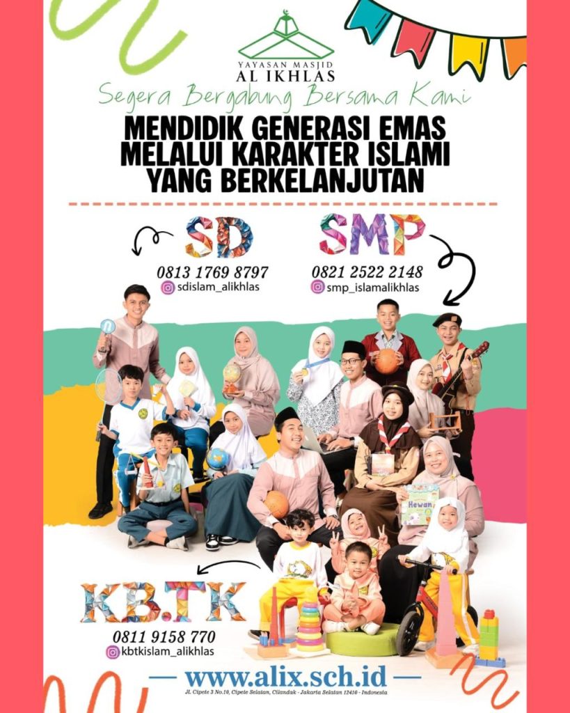 Sekolah Islam Al Ikhlas hadir dengan lingkungan islami, pembelajaran menyenangkan, fasilitas modern, dan guru yang berkompeten.